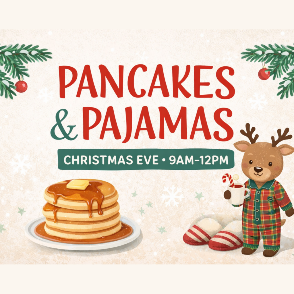 Start your Christmas Eve with a cozy and festive morning at our Pancakes & Pajamas event! Join us for a relaxed holiday breakfast featuring warm pancakes, cheerful company, and plenty of seasonal fun. Pajamas are encouraged, so come comfortable and ready to celebrate.