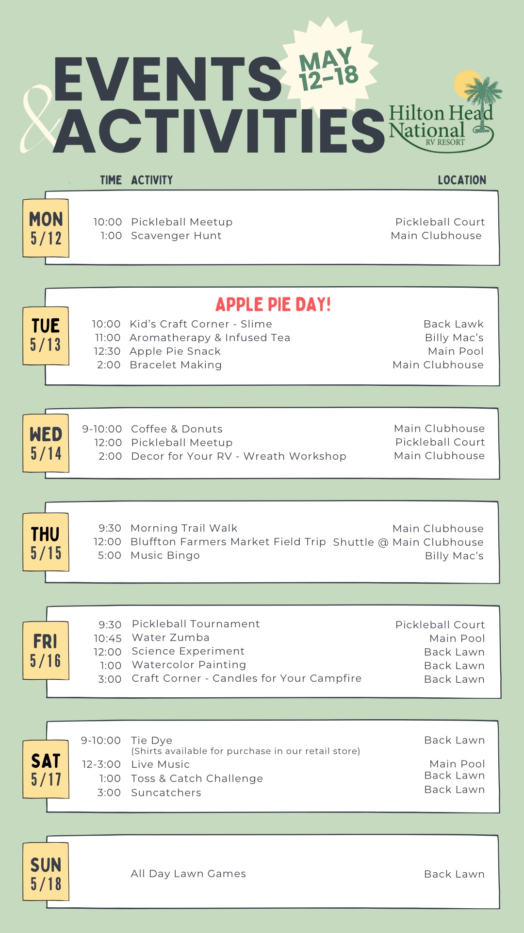 For a closer look at our resort activities and events, visit the Hilton Head National RV Resort’s activities calendar page here.