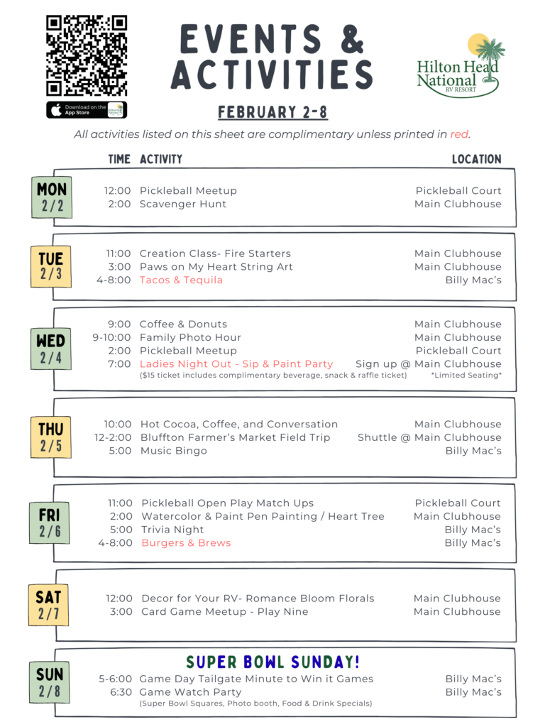 Welcome to the vibrant world of Hilton Head National RV Resort, where every day is an adventure waiting to unfold. Our Resort Activities Calendar is brimming with exciting events and activities, meticulously planned to cater to every interest and age group. From leisurely pursuits to energetic sports, our calendar is designed to enhance your stay with unforgettable experiences.