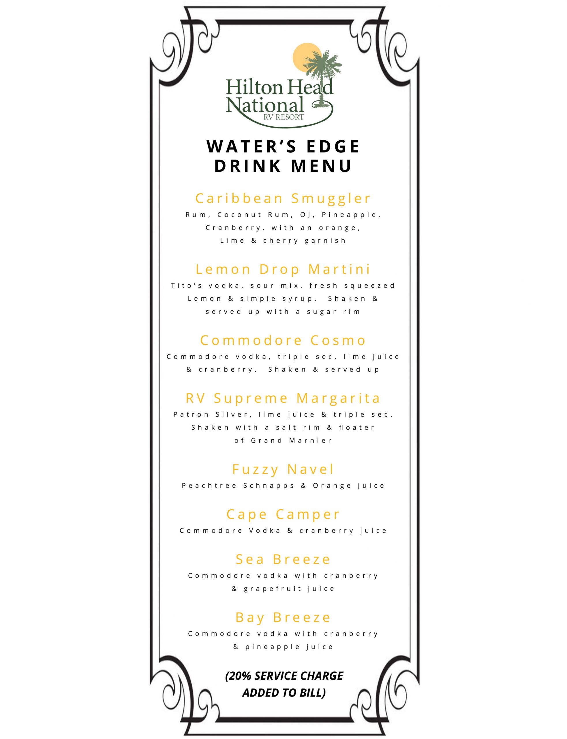 “Step into the serene ambiance of Water’s Edge Cocktail Bar, a haven where tranquility meets luxury. Located at the heart of Hilton Head National RV Resort, Water’s Edge is not just a bar; it’s an experience. Here, you can savor an array of expertly crafted cocktails, each a masterpiece of flavor, while soaking in breathtaking views of the surrounding landscape. Whether you’re toasting to a special occasion or enjoying a quiet evening, our cocktail bar offers the perfect setting. Indulge in our selection of fine wines, premium spirits, and imaginative cocktails, all while being enveloped in an atmosphere that’s both elegant and relaxed. Water’s Edge is more than a destination; it’s where memorable moments are created.”